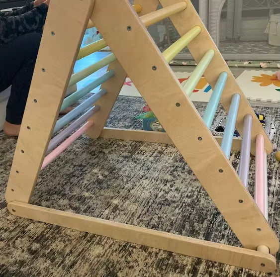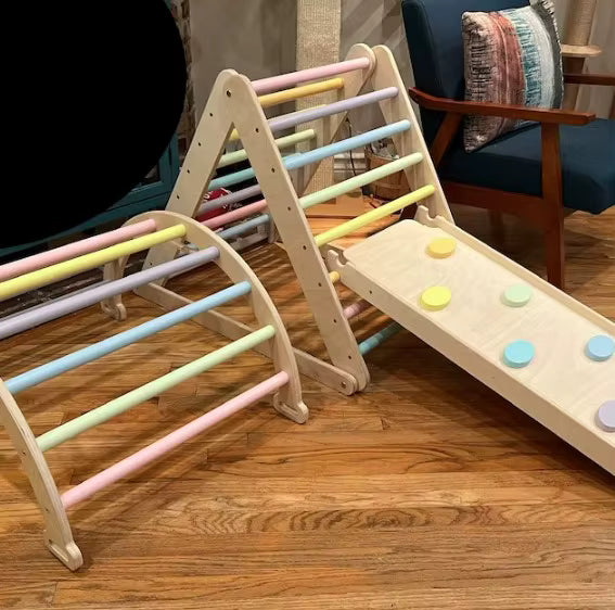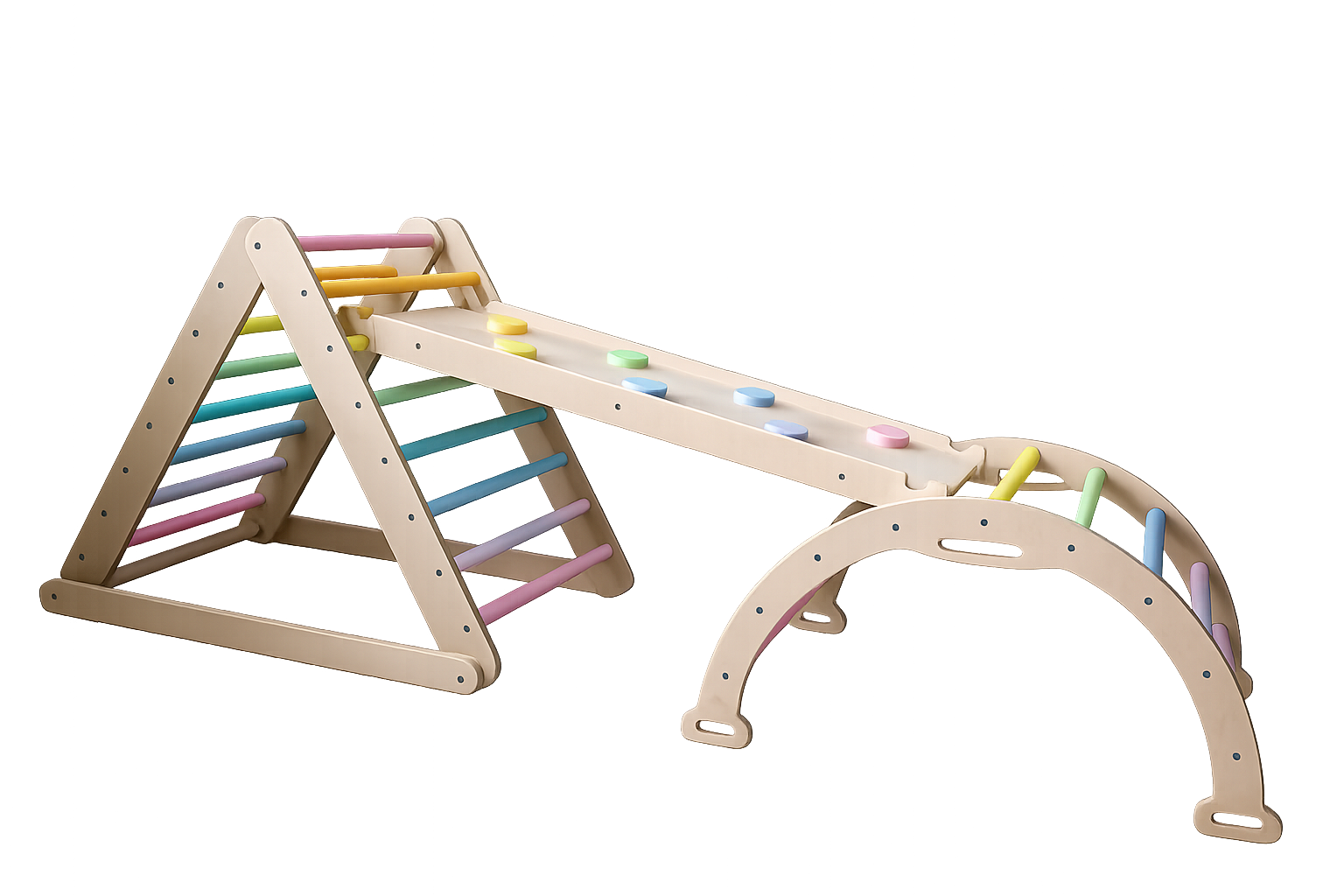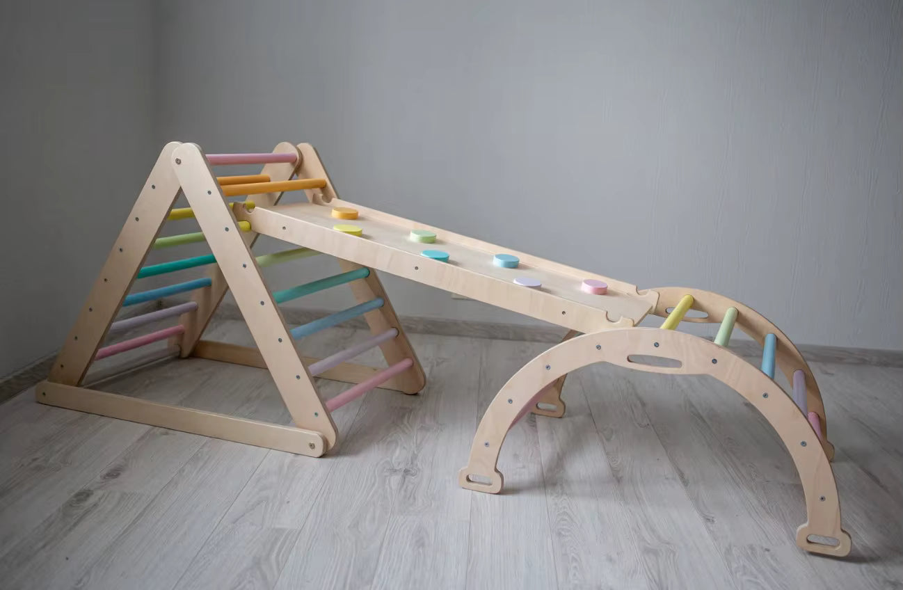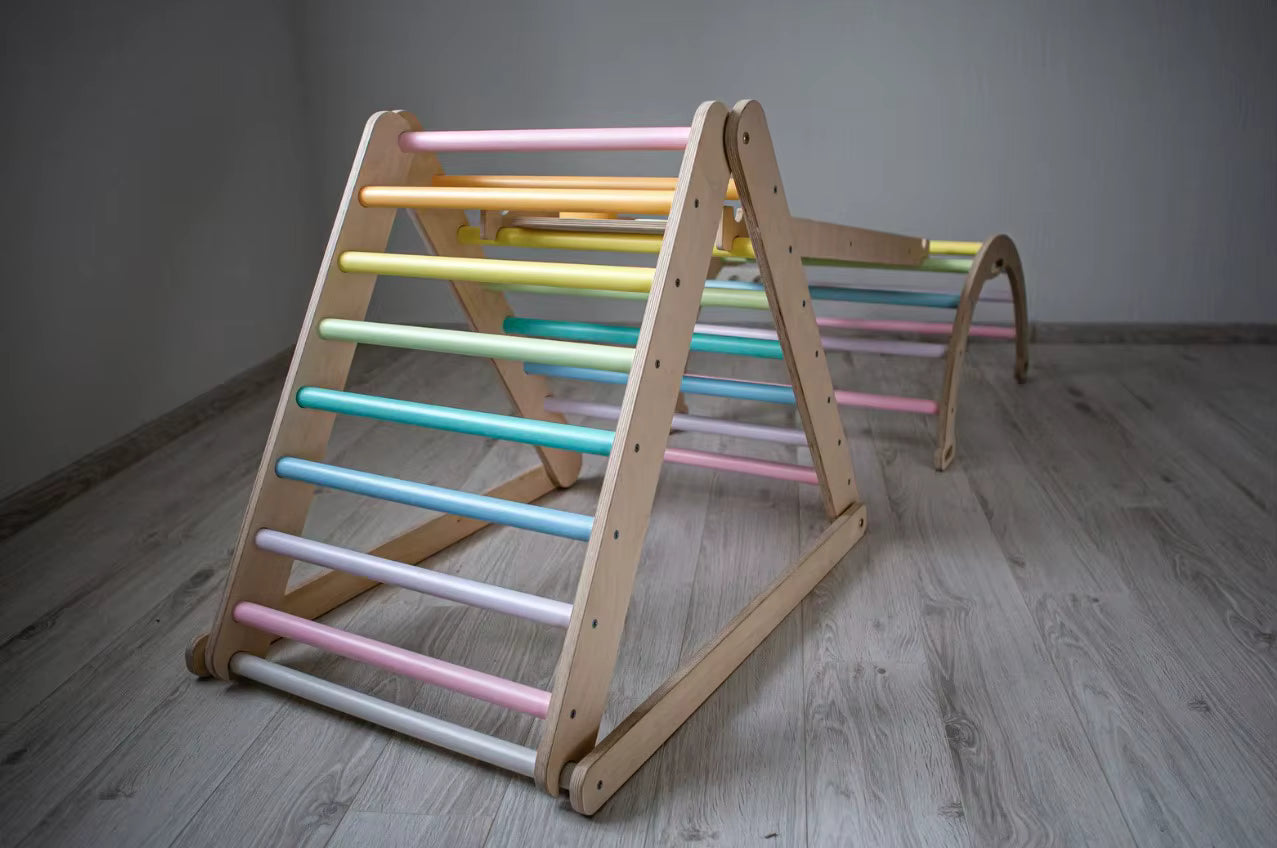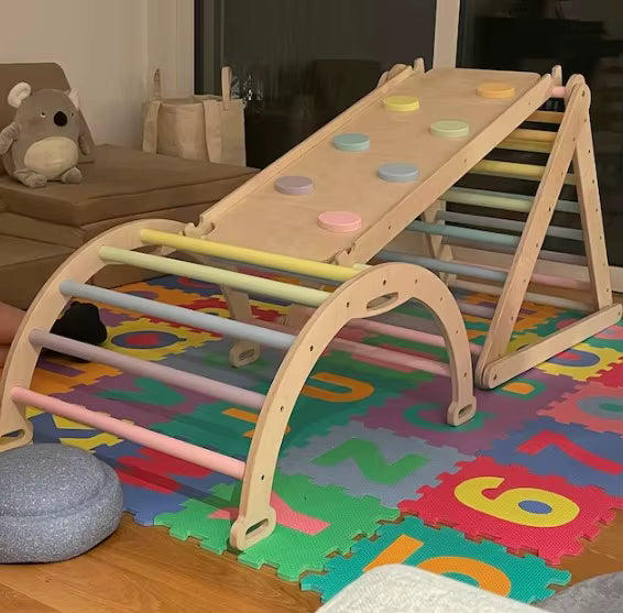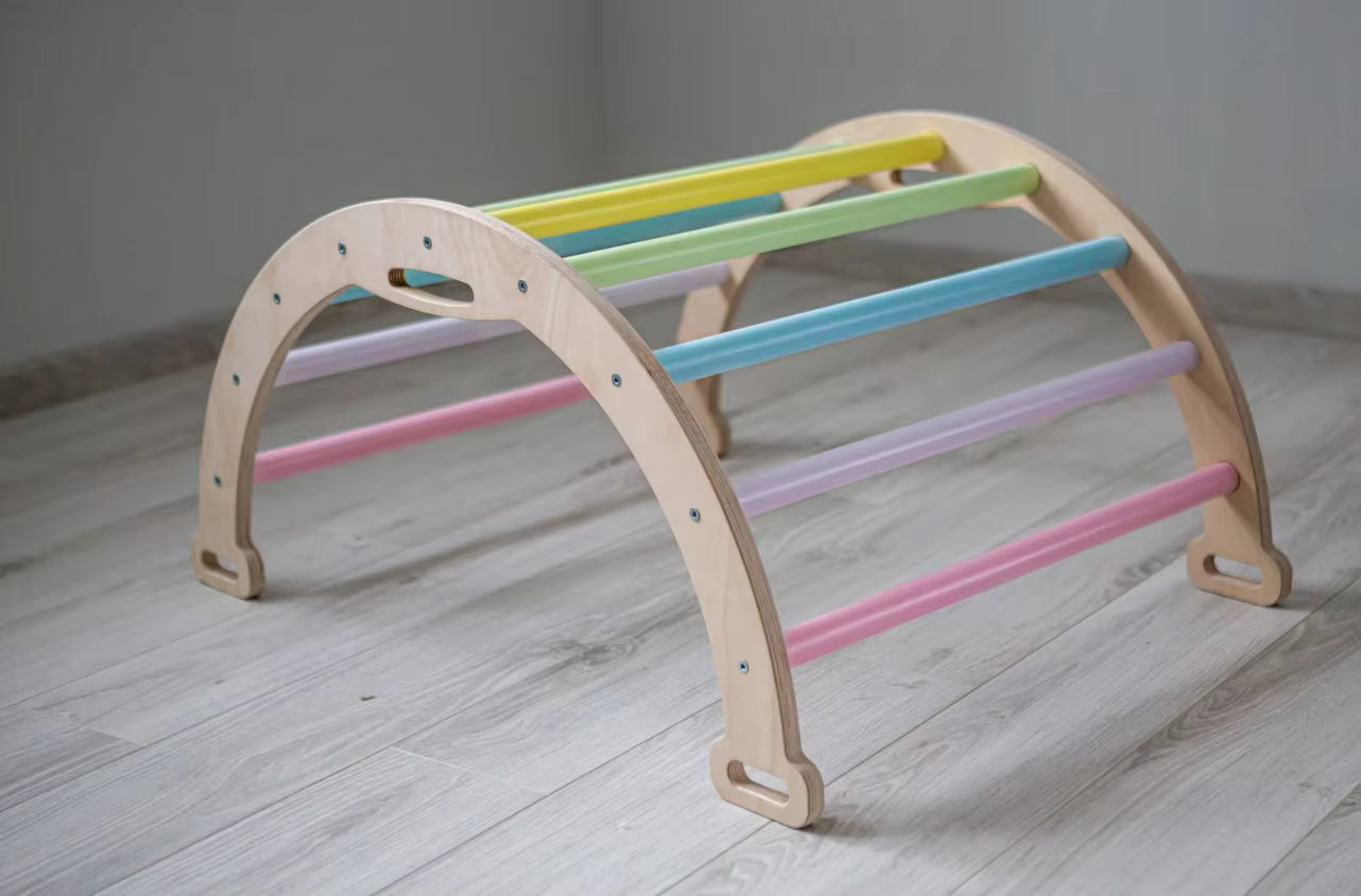 קשת פעילות מעץ רב-שימושית המשלבת שלושה שימושים באחד: קשת טיפוס, רוקר נדנדה ומנהרת משחק.